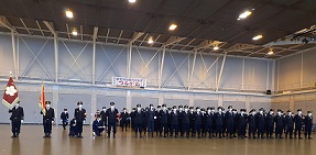 次にきらめきみなと館前に移動し分列行進が行われ各分団ごとに紹介がありました。今年の参加団員数は131名でポンプ車両は16台です。