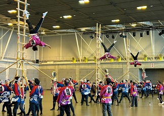 また、きらめきみなと館では「つるが鳶隊」の演技が披露されました。「しゃちほこ」や「吹き返し」「ねずみ返しなど」息の合った素晴らしい連続技が次々と飛び出し会場では大きな拍手に包まれました。つるが鳶隊の皆さんは敦賀の誇りです。これからも健康管理には注意しながら日本一の演技を披露していただきたいと思います。お疲れ様でした。