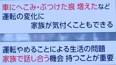 これは自分も含めてですが、家族内や知人などの車に乗せてもらった時に「ちょっと危ないなと」感じた方もいると思います。しかし、本人には自覚がありませんのでやさしく声を掛けることも大切ですね。