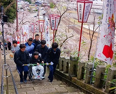 車いすに乗っていただき一歩一歩上がる階段、集中力も高まり6人のチームワークにも繋がります。頂上でも生徒は、談笑しながら車いすを押し絶景の敦賀湾を見ながら桜を楽しんでもらっています。