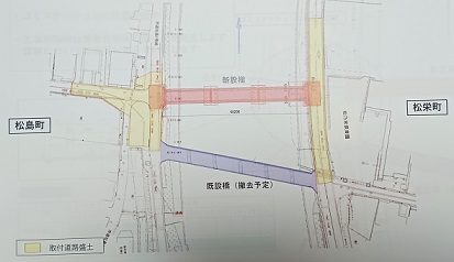 今後は橋の高さに合わせ周辺道路の嵩上げや松島町側の交差点の形状について検討されます。ここの交差点は松栄町側からの車両が今までと違い直進で入ってきますので安全確保が必要です。完成は令和8年度中とのことで他の現場も含め安全に工事を進めていただきたいと思います。