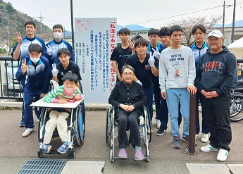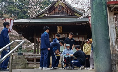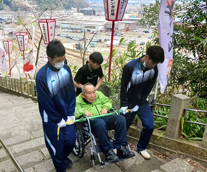 そして、今年も敦賀高校の剣道部・卓球部の生徒たちと「花籠舎(はなかごしゃ)」でボランティアを実施しました。この活動は、体の不自由な方が金ヶ崎境内まで上がることができないため車いすに乗っていただき補助する活動です。そして、桜もこの日を待ってくれたようにきれいに咲いています。