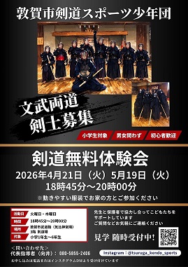 さて、敦賀市剣道スポーツ少年団では、市立武道館で4月21日(火)・5月19日(火)18:45~20:00まで剣道体験教室を実施します。礼節を重んじる剣道、友達と心身を錬磨すると共に剣道だけではなくレクレーションやボランティアなどで楽しく活動しましょう。皆さんのご来場お待ちしております。