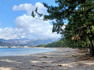 久しぶりの朝のウオーキング、気比の松原の波も穏やかです。これから砂浜には多くの釣り人が訪れます🎣