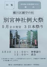 来月、5月3日に地元「別宮神社」で例大祭がおこなわれます。そしてその当日、こども達が2班に分かれて神輿で町内を巡回します。只今、こども会と神社関係の皆さんがその準備を進めています。多くのこども達の参加をお待ちしております。
