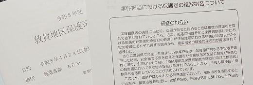 新年度になり各団体の総会が続いています。敦賀地区保護司会でも総会が開かれ、はじめの研修では「事件担当における保護司の複数指名について」担当保護観察官から説明がありました。この制度により安全面での不安や負担の軽減、処遇技術の向上を目的として複数指名の積極的な活用が推進されています。