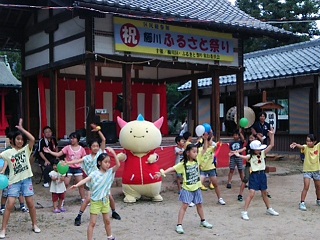さて、祭りのスタートは「福井しあわせ元気国体」が平成30年に開催されるにあたりマスコット「はぴりゅう」と子ども達のダンスです。とても上手でした。そしてその後、写真撮影会も実施しました。