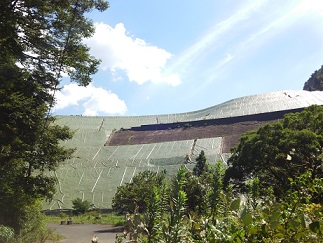 国道476号線沿い樫曲地区の山の斜面に広がるブルーシート、皆さんご存知の通り平成8年から12年までの間に違法に処分場を増設し許可量の13倍もの廃棄物の処理を行った民間最終処分場です。抜本対策工事が平成25年に完了し現在は水処理や浄化促進対策等を実施しています。