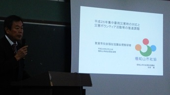 本日は、市の社協の役員研修に参加しました。研修先は京都府福知山市の社会福祉協議会です。ここは平成26年8月に集中豪雨を受け河川が氾濫し甚大な被害を受けました。