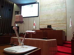 帰りに議場を見せてもらいました。今まで議場で見たことがないものが質問席にありました。手前の機器です。質問のときに手元で資料を提示しそれを3方の画面に映し出し議員が説明します。言葉では理解しにくい数字の比較や場所の図面なども映し出され質問内容も分かり易くなったとのことでした。市民の皆さんに分かり易い議会としても今後、当市議会でも検討してはと思いました。