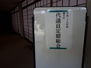 本日は、区の「平成29年度代議員定期総会」が会館で開催されました。事務局長から事業報告、決算報告等説明、その後、質問を受け承認されました。班長はじめ各委員会の皆さんの協力で1年間、スムーズに運営ができました。ありがとうございました。