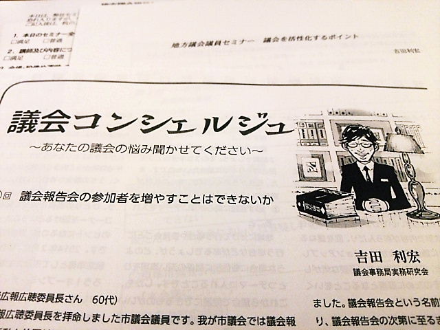 本日は吉田利宏先生の地方議会議員セミナーを受講しました。項目は「一般質問の役割と効果的な手法」「地域活性化のための議会の役割」「議員提案政策の条例のポイント」などです。特に条例の立案でできることや政策条例のポイントなど分かり易く説明されました。これまで気づかなかった部分が分かりまた事例なども紹介されとても参考になりました。