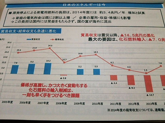 その後、資源エネルギー庁の渡邊調査官から「エネルギー政策について」の講演をお聞きしました。原発停止による発電用燃料の負担は2014年には年間約3,4兆円増加と試算、また家庭の電気料金は2割以上増、企業の雇用・収益・株価にも大きな影響がでていると・・原子力発電所については川内原発1号機が再稼働そして高浜原発3号機も規制委員会が使用前検査を始めました。また、日本原電1号機や美浜1・2号機は廃炉が決定しました。そして今後は使用済み核燃料の問題も進めなければなりません。安全性の確保を第一にしっかりと方向性を示していただきたいと思います。