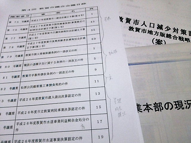 さて、これから敦賀まつりもはじまりその後、9月議会も開会します。昨日はその9月議会の告示日でした。今回は一般会計で公共施設等総合管理計画策定事業費、コミニティバス再編計画策定事業、小中教育環境検討経費など2億2617万3千円、特別会計で6749万4千円が補正案として計上されています。早速、会派内で事業概要についての調査を実施します。厳しい財政運営の中、費用対効果を検証ししっかり審議して参りたいと思います。