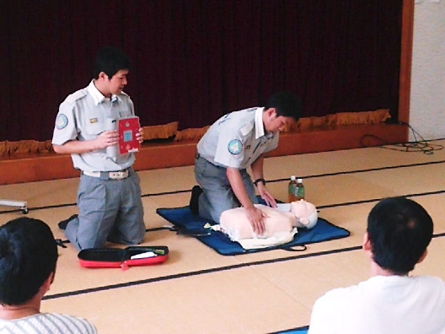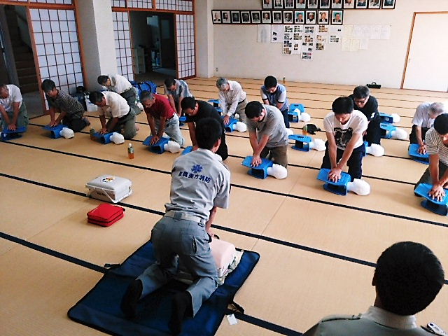 自主防災会 区内の自主防災会主催での救急救命研修会を実施しました。今回は地元の救急救命隊による心肺蘇生法とAEDの操作について学びました。 町内の会館にもAEDを設置することになりました。救急車が来るまで全国平均で約8分かかるそうです。その間にできること心臓マッサージ1分間に約100回程度することです。もしもの時にできる行動、今後も定期的に講習会などを開催したいと思います。 By まぶち清和 | 2015年9月5日 | ブログ | ← 敦賀まつり 9月定例会開会 →